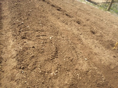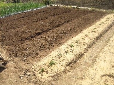 植える2週間前頃、消石灰と牛糞(牛糞が無ければ油カス)を撒き、耕運機で耕す。