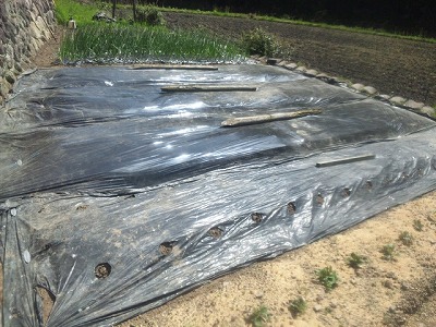 すぐに使わないスペースは雑草が生えないよう、マルチシートで覆う。
